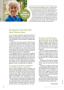 Ich habe den unsagbaren Hitler-Krieg, die Nachkriegszeit mit zehn Jahren russi- scher Besatzung erlebt und überlebt. Ich habe erfahren zu was Diktatoren im Stande sind. Ein Aggressor wie Putin darf keine Chance haben. Deshalb braucht die Ukraine jetzt unsere Hilfe und Unterstüt- zung auf allen Ebenen.